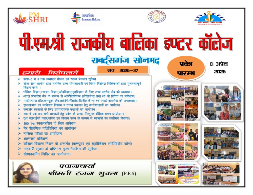 PM SHRI Rajkiya Balika Inter College, Robertsganj (Sonbhadra) is a government school dedicated to empowering girls through quality education and overall development. Under the PM SHRI initiative, the school promotes modern learning, creativity, and discipline. The annual magazine “Smriti” (2025–26, Second Edition) showcases students’ achievements, cultural activities, and talents, reflecting the vibrant and progressive environment of the institution.